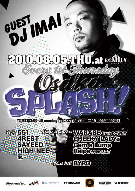 管理人さん、告知失礼します。 毎月第一木曜、DONFLEXにて、NEXT GENERATION DJ PARTY!! OSAKA SPLASH! 今回は 第一金曜GRAND Cafeにて『SUGAR』、 毎週日曜club AZUREにてALL MIX DJ PARTY『ENERGY』 マンスリー MIX CD、『LUXURY LOUNGE』 でお馴染み、DJ IMAI氏を迎えてお贈りします!! 当日キャッシャーにて 『mixiを見た』と言っていただきますと、 超激安価格にてご入場していただけます!! 8.5(THU) Every1st Thursday OSAKA SPLASH! 23:00-5:00 ADV1500yen/1d ADM2000yen/1d GUEST DJ DJ IMAI from ENERGY