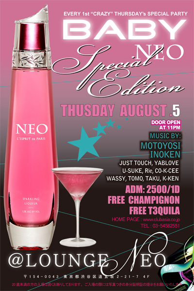 8/5(木)渋谷@VUENOS→NEO【BABY】DJオンリー大人気アットホームPARTY♪ ■OPEN:23:00〜 ■特別GUEST料金\1000 自分にメッセージ頂くと\3000の所が\1000と大変お得なゲストお取り致します DJ MOTOYOSI!!DJ INOKENとMC CTを筆頭にキャリア&スキルフルな間違いない11DJ'sで作り上げた本当にアットホームで楽しいParty VUENOS 第一木曜日とえば★BABY★です 毎月BABYは450人以上ものお客さんが遊びに来て大盛り上がりのParty へーい!へーい!平日! そう、最熱木曜「BABY」 今月のみBABYはVUE