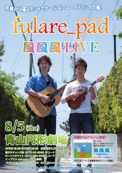 フラリーパッド待望のニューアルバムが完成しました! アルバムタイトルは「風風風〜fufufu〜」。 ニューアルバムの発売を記念して、フラリー初のホールライブを開催します!!! レコーディングに参加してくれた、大和田ハルヲ(Bass)、丹菊正和(Percussion)をサポートに迎えて、ニューアルバムからの新曲を中心に披露。もちろん、フラリーの名曲も織り交ぜていきますよ。 真夏の東京にホットでクールな風を届けてくれること間違いなし!!! またニューアルバムもこの日から、ライブ会場先行発売開始です。 ニューアルバムを一早くGETで