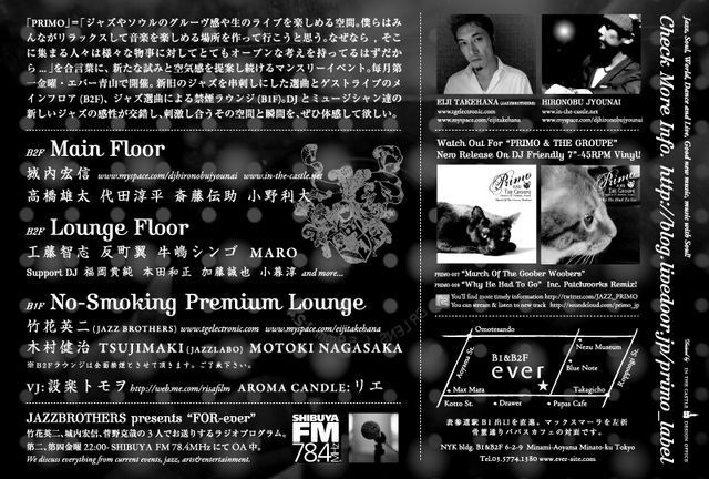 ジャズやソウルのグルーヴ感や生のライブを楽しめる空間。僕らはみんながリラックスして音楽を楽しめる場所を作って行こうと思う。なぜなら,そこ に集まる人々は様々な物事に対してとてもオープンな考えを持ってるはずだから... 」を合言葉に、新たな試みと空気感を提案し続けるマンスリーイベント。新旧のジャズ音源を串刺しにした選曲とゲストライブのメインフロア(B2F)、スピ リチュアルジャズ選曲による禁煙ラウンジ(B2F)。DJとミ