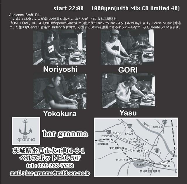 『 ONE LOVE 』は、4人のDJがOpenからLastまで3曲交代のBack to BackスタイルでPlayします。House Musicを中心とした様々なGenreの音楽でThrillingな瞬間や、心温まるStoryを展開できるように、みんなで一夜をCreateしていきます。