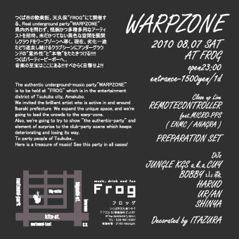 The authentic underground-music party "WARPZONE" is to be held at "FROG"