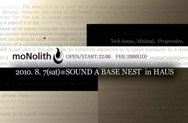 2月よりスタートした新感覚アンダーグラウンドパーティー、moNolith -モノリスー。Tech house、Minimalを主体とした最先端のサウンドと、野外を彷彿させるデコレーションでフロアを演出。回を重ねるごとに着実にその存在感を高めている。
