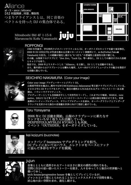 山梨県下の各イベントのオーガナイザー、コンポーザーやDJが、今の山梨のハウス・テクノシーンを牽引するべく各自の持ち前の世界感を集結させたクラブイベント、Allianceが8月7日(土)、更に規模を拡大して堂々開催する