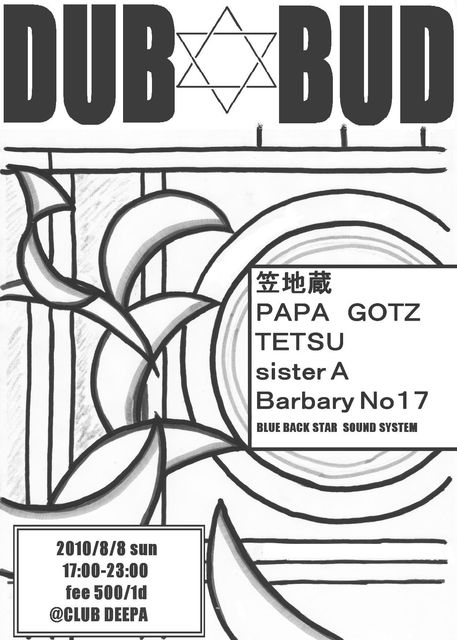 DUB☆BUD The second 笠地蔵 (SPECIAL BLEND) PAPA GOTZ TETSU sister A Barbary No17 BLUE BACK STAR SOUND SYSTEM 17:00-23:00 500/1D @CLUB DEEPA 千葉県千葉市中央区中央4−2−1 森下千葉中央ビル6F DUBBUD http://mixi.jp/view_community.pl?id=5061781