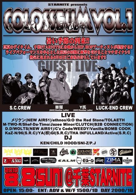 イベントの告知を失礼致します。 この夏最強のライブイベント!! 豪華出演陣でお届け致します!! 2010.8.8(SUN) STARNITE presents COLOSSEUM VOL.1 GUEST LIVE: S.C.CREW/単駆(NHC/Hustlaz Latte)/Y氏(NHC/Hustlaz Latte)/LUCK-END CREW LIVE: メリケン(NEW AIR51)/ethnos/G:O the Red Stone/TOLAETH/M-TWO-R/Shef-Da-Timo/Jazee Minor/CLUTCH(B2B CONNECTION)/D.D/WOLTS(NEW AIR51)/C'z Code/WEEDY/Vanilla/KaZ-N/BOMB COOK/96(S.R.C)/YA(柳)GI(S.R.C)/THA INFULL AND(S.R.C)/Active(S.R.C) DJ: KEN/CHILD HOOD/SNI-Z/P.J OPEN: 15:00-