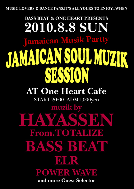 2010.8/8(SUN) BASS BEAT & ONE HEART PRESENTS 「JAMAICAN SOUL MUZIK SESSION」 One Heart Cafe(千葉県・一宮町) http://mixi.jp/view_community.pl?id=1373713 千葉県長生郡一宮町東浪見7386-1 TEL: 0475-42-1614 START20:00-Till Morning ADM:\1,000/Drink別 -Music by- Special Guest HAYASSEN-from TOTALIZE http://mixi.jp/view_community.pl?id=583504 http://mixi.jp/view_community.pl?id=1961130 BASS BEAT http://mixi.jp/view_community.pl?id=3630709 NAKACHANG ELR POWER WAVE