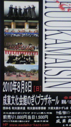 こんにちは 千葉県を拠点に活動している『和太鼓風』のINAと申します この度、和太鼓風主催による創作和太鼓コンサート『風華舞心』2010を開催させて頂くこととなりました 【日時】2010年8月8日(日)12時半開場、13時開演 【会場】成東文化会館のぎくプラザ 【チケット】1000円 【出演団体】和太鼓風・和太鼓風Jr・大塚太鼓かずら会・和太鼓求道・和太鼓柏菩提樹 ※チケットは和太鼓風ホームページにて販売しております www.wadaiko-kaze.com 直接私にメッセージを頂い
