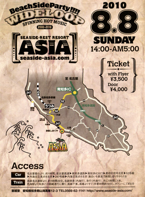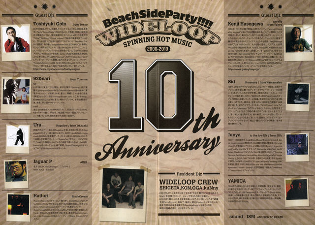 昨年DJ GARTH、PEPE CLIFORNIAと共に繰り広げた至福の一時 wideloop"beach side party" 今年は10th anniversary special party!! 各地より、素敵なDJをゲストに迎えての開催! お見逃しなく!! 8/8(sun) wideloop "10th anniversary" beach side party @亜細亜(内海) Guest DJ: Toshiyuki Goto(東京) Kenji Hasegawa(Gallery 東京) 92&sari(富山) Sid(Harmony 浜松) Junya(To the low life 岐阜) Ura(Ragslow・ひかりのラウンジ 岡崎) Hattori(Black Cleam,pigeon records) Jaguar P(AUDI) YAMICA
