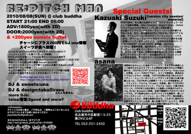 geekyのフライヤー作ってますたかふぇ。です このたびイベントを立ち上げることになったのでお暇な方は来てみてくださいませませ 【Re:Pitch Man】リ:ピッチマン http://iflyer.tv/event/62998/RePich-Man/ @club buddha 2010/08/08(SUN)21:00〜MID ADV:1800yen(2D) DOOR:2000yen(2D) and +200yen sweets buffet (by DJ una) GENRE:ROCK/HOUSE/and ALL/POST MODERN POP! GUEST: Kazuaki Suzuki [version city session/material] http://www.myspace.com/versioncitysession asana http://mixi.jp/view_community.pl?id