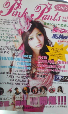 5th♪Anniversary★PinkPantsvol.17★ 管理人様失礼します。 OZONで8月8日に開催するイベントの告知です☆ ぜひ遊びに来てください☆ 5周年ANNIVERSARY PinkPants 8月W開催決定 SpyMaster『GOGO!!野外フェス&CLUB』でPinkPantsが紹介されています P164、166掲載 vol.17 SpyMaster撮影隊が 入ります 2010年8月8日 @名古屋OZON OPEN 19:00〜 vol.18 2010年8月20日 @岡崎Red