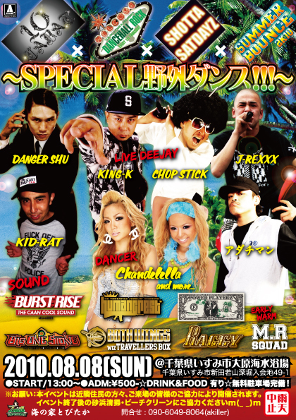 告知失礼します。 2007年より毎夏開催している大原海水浴場での野外ダンス! 今夏は東京、横浜、千葉で毎月開催している人気ダンスとコラボしてのSPECIAL 野外ダンス!!!!! SOUNDをはじめDEEJAY、DANCERと一線で活躍している豪華出演者がズラリ!!! 青い海と青空の下、良質な音・酒・飯で楽しみませんか??? ドリンク、フードはもちろん、バナナボートなどの遊具も完備!並びには【とびたか】による海の家施設もあります。 昨年は2回開催しましたが本年は1回の開催となっていますのでお見逃し無く☆ 2010.08.08(SUN) 【