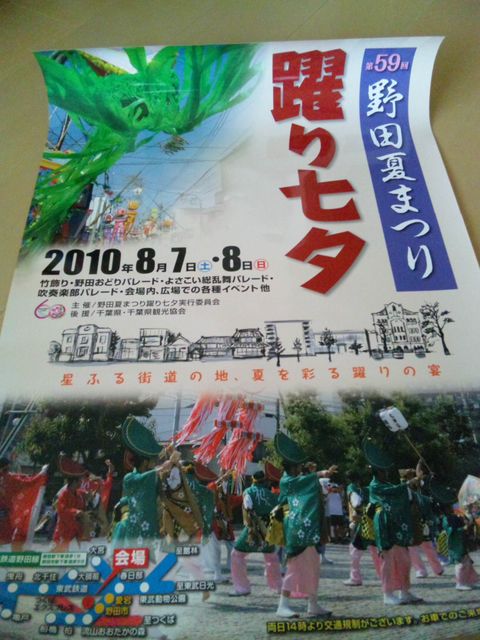 野田の季節がやってまいりましたー 8/8と言えば夏の真っ只中 けれど、野田夏祭りは身体に優しいので開催時間がやや遅めです 午前中に用を済ませてきても間に合うかも 今年は有り難いことにポスターに載せて頂きました。 感謝致します ミンナで野田に遊びに来て(〃゚∀゚)(゚∀゚〃)ネェー 【礼神伝演舞時間】 ■4:04〜 流し踊り(キッコーマン本社前からチョロッと歩けば見えます) ■5:19〜 ステージ(キッコーマン本社前) ■最寄り駅 東武野田線「野田市駅」から徒歩5分