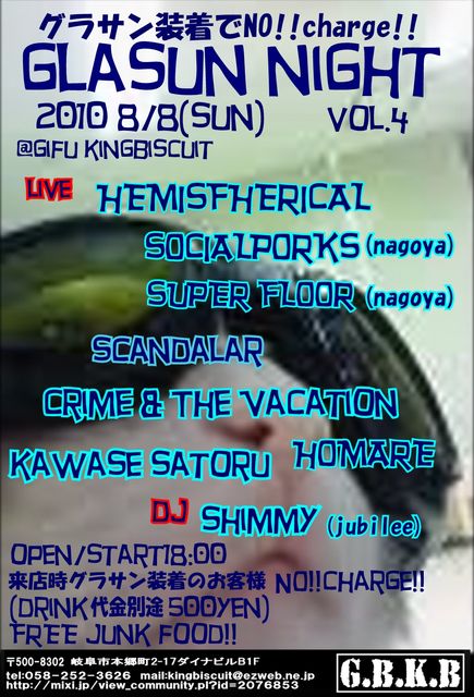 <<<グラサンナイト!!vol.4>>> 2010 8/8(sun) @gifu kingbiscuit ☆グラサン装着でノーチャージ!☆ live :HEMISPHERICAL http://hemi-hc.com/ :SOCIALPORKS(nagoya) http://www.myspace.com/socialporks :SUPER FLOOR(nagoya) http://www.myspace.com/thesuperfloor.official :scandalar :Crime & The Vacation :HOMARE(THE CAST ABOUT) :KAWASE SATORU dj :shimmy(jubilee) open/start 18:00 来店時グラサン装着のお客様 NO!CHARGE!! (DRINK代金別途\500) FREE JUNKFOOD!!