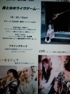 8月8日 たいへん末広がりでおめでたいこの日に しーシュがイベントをいたします。 「男と女のライヴゲーム…」 まぁ、男女デュオのライヴ、てことなんですケド (クスッと笑ってくださる方は年齢が限定されるかもしれません) 「男と女のライヴゲーム…」 8月8日(日) フライングキッズ(広島市中区鉄砲町8-24 にしたやビル2F 082-224-4692) 18:00 / Open 18:30 / Start チャージ2000円(前売り 1ドリンク込み) 奈良から「illy@奏」 http://mixi.jp/show_friend.pl?id=5443170&from=navi という注目株!の