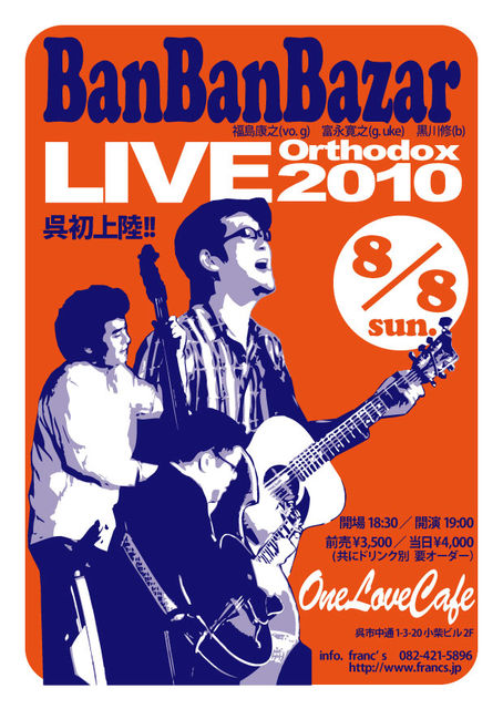 お待たせしました! 我らがバンバンバザール初の呉ライブ正式決定です!! ■ Ban Ban Bazar Live Orthodox 2010 in Kure ■ 日時:2010年8月8日(日) 開場 18:30 / 開演 19:00 会場:One Love Cafe 呉市中通1-3-20 小柴ビル 2F Tel 0823-23-7481 チケット:前売 3,500円 / 当日 4,000円 (共にドリンク代別 要オーダー) チケット販売・予約 ・franc's Tel&Fax 082-421-5896 francs@circus.ocn.ne.jp http://francs.jp ・