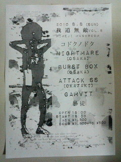 『我道無敵 Vol.08』 ●NIGHTMARE(大阪) ●BURST BOX(大阪) ●ATTACK SS(岡崎) ●GAMViT ●コドクノドク ●暴徒 OPEN/START→18:00/18:30 ADV/OPEN→\1500/\1800(+共に1drink\500) INFO:マッシュルーム TEL0792885559 メールmushroom@restin11.com 常に姫路PUNKシーンに撃鉄を打ち込み続ける暴れん坊将軍『暴徒』の自主企画第八弾! 今回の刺客は, 日本HCシーンの至宝『NIGHTMARE』! 岡崎が産んだNOISE CORE KILLER『ATTACK SS』! 大阪暴走HARDCORE PUNX『BURST BOX』! 姫路からは 遂に復活!変拍子の暗闇を無灯火で