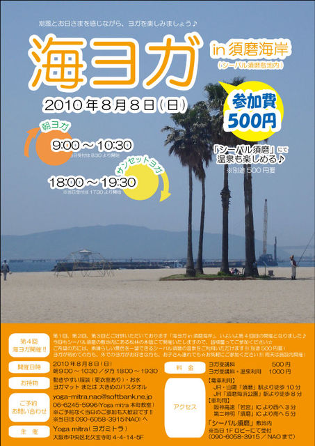 管理人様、お世話になっております☆ ◆◆◆『海ヨガin須磨海岸』◆◆◆ 【日時】 2010年8月8日(日) 朝ヨガ :9:00〜10:30(当日受付8:30開始) サンセットヨガ:18:00〜19:30(当日受付17:30開始) 【料金】 ヨガ受講のみ :500円 ヨガ受講+シーパル温泉利用:1,000円 【場所】 ■シーパル須磨敷地内■ (雨天の場合はシーパル須磨施設内) ※木陰での開催となります。 〒654-0055 神戸市須磨区須磨浦通1-1-1 【アクセス】 《電車利用》 JR・山陽