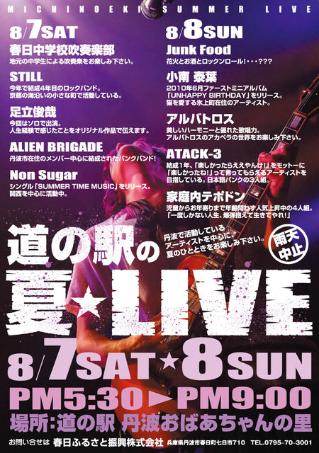 道の駅の「夏・LIVE」 2010年8月8日 @道の駅 丹波おばあちゃんの里 〒669-3141 兵庫県丹波市春日町七日市710 Tel.0795-70-3001 http://www.michi-kasuga.jp/ 午後5時30分頃より~午後9時まで 雨天中止 ※小南泰葉の出番は 電話で問い合せたところ、 PM6:40前後が目安になりそうという事です。 ※あらかじめご確認ください。 イベント情報 道の駅の「夏・LIVE」・・・ご案内 道の駅では、8月7日(土)、8日(日)の両日午後5時30分頃より「夏・LIVE」を開催致します。 今年の夏のイベントは、【初企画