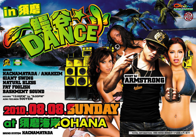 管理人様告知失礼します。 毎月第一金曜日に大阪SAM&DAVE 02で開催中のイベント 『 鰻谷DANCE 』 毎回300名を超え12時になる頃には店内はもうパンパン その鰻谷DANCEが何と今年はゲストにARMSTRONGを迎え 須磨海岸で開催が決定 しかも入場料が500円次の日曜日に 入場制限の可能性がありますのでご注意を 8/8 鰻谷DANCE in 須磨海岸 GUEST DJ : ARMSTRONG SOUND : HACNAMATADA / ANAHEIM G
