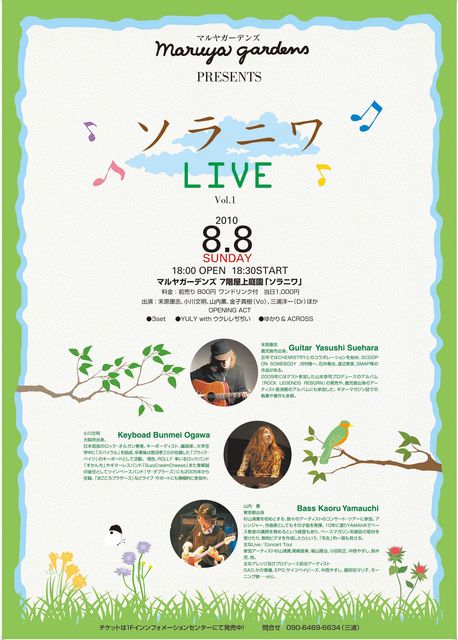 MaruyaGardens Presents 「ソラニワLive」Vol.1 出演:末原康志(G) 小川文明(Key) 山内薫(B) 金子真樹(Vo) 三浦洋一(Dr) 東京組プロミュージシャンとのセッションバンドだけど、実はこの編成でやるのは初めて! オープニング・アクト 3SET(末原兄弟のコラボですよ!) YULYwithウクレレぢぢい ゆかり&ACROSS(マイミクだいちゃんのバンド) 日時:8月8日 18:00Open 18:30Start 場所:マルヤガーデンズ7F屋上庭園「ソラ