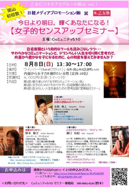 管理人さま、告知スペースをお借りいたします。 コミュニティご参加の皆さま。 こんばんは。 けいちゃんこと、野本敬子と申します。 この度、岡山県では初招致となります 「日経メディアプロモーション」中四国統括の方をお招きしまして 女性限定の女子力UPセミナー <日経×乙女塾>「女子的センスアップセミナー」を 企画・開催することになりましたので、ご案内させていただきます。 ☆「ジブンらしく」輝くワタシでありたい☆ 今やすっかり流行語となり、 2010年に身につけたい○○力の女