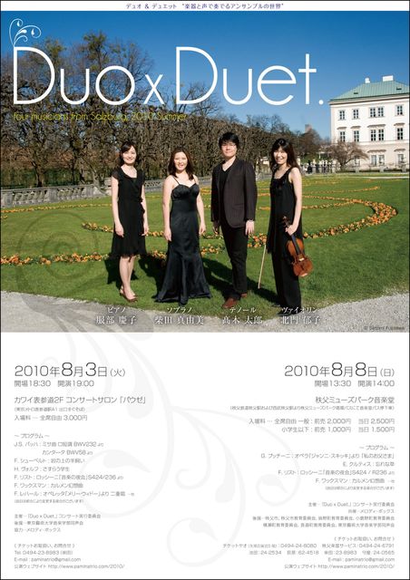 Duo¡Ê¥Ç¥å¥ª¡Ë¡§Æó½ÅÁÕ x Duet¡Ê¥Ç¥å¥¨¥Ã¥È¡Ë¡§Æó½Å¾§ Åìµþ麽ÑÂç³Ø¤Ç³Ø¤Ó¡¢¥¶¥ë¥Ä¥Ö¥ë¥°¡¦¥â¡¼¥Ä¥¡¥ë¥Æ¥¦¥à²»³ÚÂç³Ø¤ÇºÆ¤Ó½ä¤ê¹ç¤Ã¤¿¼ã¼ê²»³Ú²È4¿Í¤Ë¤è¤ë¥ë¥Í¥Ã¥µ¥ó¥¹¤«¤é¥í¥Þ¥óÇÉ¡¢¤Þ¤¿¥½¥í¤«¤é»Í½ÅÁդޤǡ¦¡¦¡¦ ÍÍ¡¹¤Ê¥¹¥¿¥¤¥ë¤Ç¤ªÆÏ¤±¤¹¤ë¥¢¥ó¥µ¥ó¥Ö¥ë¡¦¥³¥ó¥µ¡¼¥È¡£ ¥½¥×¥é¥Î¡§¡¡¼ÆÅÄ¿¿Í³Èþ¡¡¡¡¡¡¡¡¡¡¡¡¡¡¥Æ¥Î¡¼¥ë¡§¡¡üâÌÚÂÀϺ ¥ô¥¡¥¤¥ª¥ê¥ó¡§¡¡ËÌÌç°ê»Ò¡¡¡¡¡¡¡¡¡¡¡¡¥Ô¥¢¥Î¡§¡¡ÉþÉô·Ä»Ò ³Æ±éÁռԤΥץí¥Õ¥£¡¼¥ë¤Ï¡¢¸ø±é¥¦¥§¥Ö¥µ¥¤¥È¡Êhttp://www.paminatrio.com/2010¡Ë¤ò ¤´Í÷¤¯¤À¤µ¤¤¡£ ÃáÉã¥ß¥å¡¼¥º¥Ñ¡¼¥¯²»³ÚƲ¡¡