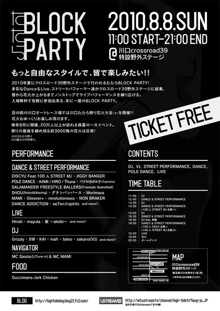 ´ÉÍý¿ÍÍÍ¡¢¥¤¥Ù¥ó¥È¹ðÃΤò¼ºÎéÃפ·¤Þ¤¹¡£ 2010ǯ²Æ¡¢³«ºÅ·èÄê! ¡ú¡ú8/8 ¤¿¤¿¤éBLOCK PARTY¡ú¡úsupported by Tune in 2010/8/8(SUN) 11:00-21:00 Æþ¾ì̵ÎÁ/Àî¸ýcrossroad39 ÆÃÀßÌî³°¥¹¥Æ¡¼¥¸ http://mixi.jp/view_community.pl?id=2854320 http://hightideblog.blog22.fc2.com/ ¡Á¤â¤Ã¤È¼«Í³¤Ê¥¹¥¿¥¤¥ë¤Ç¡¢³§¤Ç³Ú¤·¤ß¤¿¤¤!!¡Á 2010ǯ²Æ¤Ë¥¯¥í¥¹¥í¡¼¥É39Ìî³°¥¹¥Æ¡¼¥¸¤Ç¹Ô¤ï¤ì¤ë ¤¿¤¿¤éBLOCK PARTY¤Ë ¡ÖTune in¡×(http://blog.livedoor.jp/tunein_2008/)¤¬»²²Ã!! ¿ºÌ¤ÊDance¡õLive¡¢¥¹¥È¥ê¡¼¥È¥Ñ¥Õ¥©¡¼¥Þ¡¼Ã£