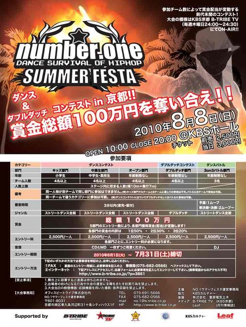 管理人様失礼します、不適切な場合はお手数ですが、削除してください。 ビートライブが送る、この夏最大に熱いコンテストがKBSホールにて開催!! 各部門の参加数によって賞金配分が変動する新しく公平なシステム!! 現在、関西はもちろん、東海地区や広島からのチームが続々エントリー中!! オフィシャルホームページ↓↓ http://www.b-tribe.co.jp/?p=3793#more-3793 【イベント概要】 イベント名:『NO.1 SUMMER FESTA』 開催日時: 2010年8月8日(日)OPEN10:00* CLOSE20:00* 会場: KBSホール 料金: