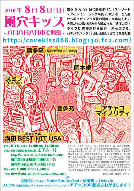 告知失礼します! 「ストリートスタイルミュージック奈良2010」を どん底から救ったメンツが夏の滋賀に大集結! あの大変だった取り組みから解放され、近江の国へライブ&慰安旅行を敢行! 真昼間から繰り広げられるライブ&トーク、妖怪地の風穴ではキッスも不潔! 老若男女、みんなが喜ぶ千円均一!! 末も広がる、パチパチパンダ!!! 八月八日は八日市に集結だい!!!! 2010年8月8日(日) @滋賀東近江 太子ホール 開場:14:00 開演:14:30 前売:1,000円 当日:1,500円 出演: Octavio htt