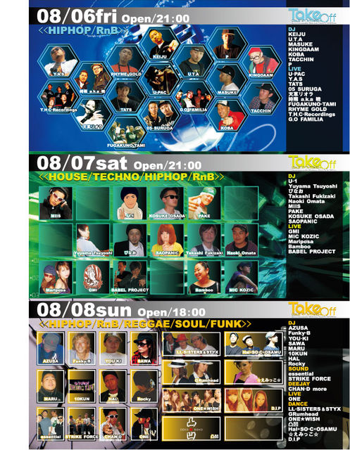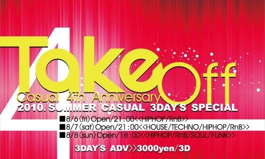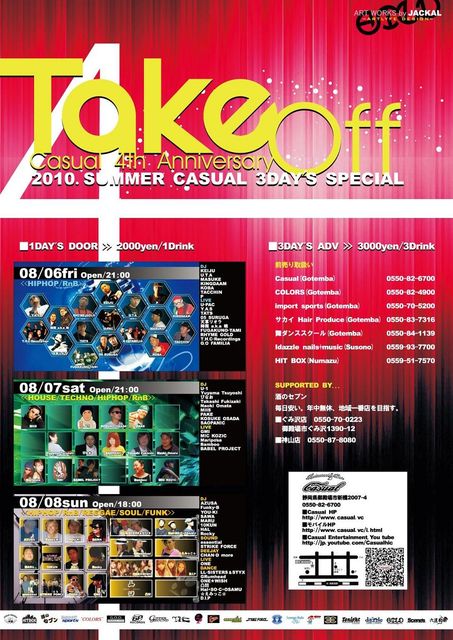★Take-off★ Casual 4th anniversary party 2010年みなさまのご期待に答えるべくあのMonster EVENTが再来... 今年も★Take-off★は御殿場の夏祭りを完全に-Lock on- 地元御殿場の間違いないメンバー、静岡全土を騒がせるあのアーティスト、今話題のあの方々まで総勢80名以上のアーティストが御殿場Casualに大集結。 毎年恒例の御殿場のサマフェス、最高に熱い真夏の3日間がやってくる! 2010年夏Casual 4th anniversary ★Take-off4★伝説から伝統へ!! 2010 Take-off4 予告動画 Casual Entertainment. You tube http: