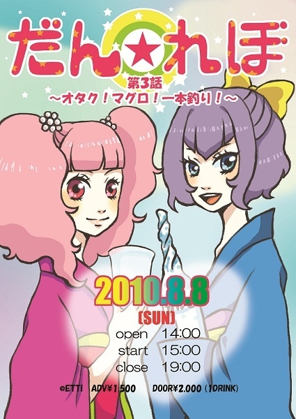 ☆☆開催決定☆☆ 『だん☆れぼ』 第三話 〜オタク!マグロ!一本釣り!〜 ■日時 2010/8/8(日曜日) ■open 14:00 ■start 15:00 ■close 19:00 ■場所 ETTI(ドンキホーテ6F) 静岡県静岡市葵区紺屋町12−1 054-254-7316 (周辺地図) http://maps.google.co.jp/maps/place?cid=2570677646172830818&q=静岡 ETTI&hl=ja&gl=jp ■ADV ¥1,500(1ドリンク) ■DOOR ¥2,000(1ドリンク) ■コスプレに関する注意☆ ・コスプレ可能です!!