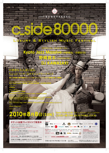 8月8日(日)、浜松、八幡宮、c_side80000【シーサイドハチマン】... 何だか縁起良さそうなこのイベント DJ KAWASAKIさん、約4年振りに来浜です!! 前売りチケット、全国プレイガイドにて絶賛発売中! 近隣の方々、ぜひぜひお越しください! ====================================== 「 c_side80000 【シーサイドハチマン】 - LUXURY & STYLISH MUSIC FESTIVAL - 」 powered by KURETAKESO お洒落な大人達に送る、ちょっと「リッチ」なラグジュアリーイベント