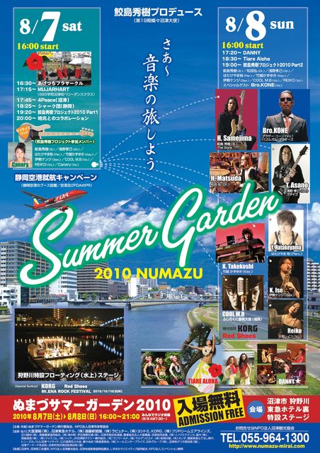 いよいよベールを脱ぎます! キャッ! 見せちゃいますよ! 「ぬまづサマーガーデン2010」 今年のテーマは「交流」 祝!静岡空港開港1年 なにせ!本業観光協会ですので・・・そんな感じでこんな感じです(笑) 今までのポスターの中では一番さわやか! 初日は地元とのコラボレーションって感じで! 8月7日(土) 16:30〜 あげつちフラサークル 17:15〜 MUJARHART(SBS学苑沼津校ベリーダンスクラス) 17:45〜 4Peace 18:25〜 シャーク団 19:20〜 鮫島プロジェクト2010 Part1 20:00