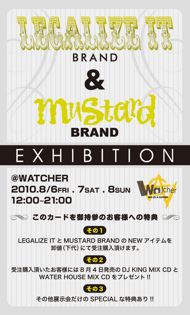 管理人様告知失礼します LEGALIZE IT & MUSTARD BRAND 合同展示会 この度静岡を代表するREGGAE SOUND RG CREW がプロデュースするWATER HOUSE のアパレルブランド『LEGALIZE IT』と静岡のアパレルショップ WATCHER のオリジナルブランド『MUSTARD BRAND』が合同展示会を開催する事になりました! 8月6日金曜日から8日日曜日までの3日間! 場所は静岡市葵区人宿町の WATCHER にて開催されます! 展示会期間中にご来場頂いた方にはLEGALIZE ITとMUSTARD BRANDの新作商品を商品の卸値(下代)にて購入して頂けます! そしてサン