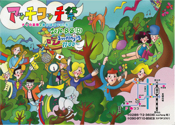 暑い夏が始まりました。 今年も、去年に引き続き、益子町のカフェzuofang吃にて素敵な夏祭り&ライブをします。 子連れでも安心なイベントをしよう!ということで、去年から始まったお祭り。 ノンビリ、ユックリして下さい。 飛び入りで、『流しソーメン』も参加予定です。 みなさん、お待ちしています! ■■『アッチコッチ祭』チィの夏祭&あけぼのvol.6■■ ■2010.8.8(日) ■@zuofang吃(益子町塙490) http://zuofang.seesaa.net ◆◆『チィの夏祭』午前11時から∞∞◆◆ ダッダァーン!! チィの夏祭がやって来た!! 縁日・