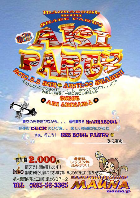 管理人様、皆様こんにちは。 この場をお借りして、プチイベントの告知を させていただきます。 どうぞ、宜しくお願い致しますm(__)m ☆☆☆ ☆☆☆ ☆ ☆☆☆ ☆☆☆ MAUNA&ひこうきより、夏のプチイベントのお知らせです。 来る8月8日(日)♪♪AM11:00〜 ゲストに、ひこうきBIG POWER SUPPORTER アキ秋山プロを お迎えして、心潤う ☆MINI AKI PARTY☆ を開催いたします。 夏空の光の下、AKIさんと心躍るSKATE SESSION! そして、出逢いを大切にした、あたたかなPARTYデス(*^_^*) ノ