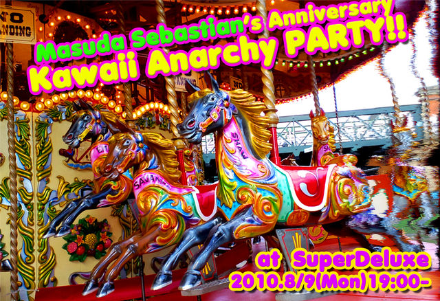 8/9(月曜)に、西麻布superdeluxeで ★KAWAII Anarchy PARTY★を開催いたします! どなたでも参加できますので、 みなさまお誘いあわせてお越しください! フランスからPrincess Puddingちゃん、 NAFRA YOUちゃんも遊びにきてくれますー 「増田セバスチャン's Anniversary★KAWAII Anarchy PARTY★」 開場/ 開演...19:00 料金...無料(要ドリンクオーダー) Live: Les cocottes(もりばやしみほhi-posi&YUKA東京キャ☆バニー)、 V/ORDER(マロン& ロラコルピ) DJ: Mimiyo、 Sascii (dokidoki from paris)、