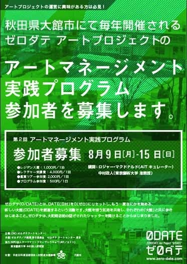 ゼロダテアートプロジェクト 【第2回アートマネジメント実践プログラム開催】 ゼロダテアートプロジェクトは、豊かな自然や人に溢れた秋田県大館市で2007年より開催されています。今年は、1週間程度の秋田県大館市滞在によって、アートプロジェクトの現場を体験できる実践プログラムを開催します。このプログラムは、アートプロジェクトを作り上げる現場に飛び込み、レクチャー、リサーチ、運営業務の実践を通して、机上で学べないアートマネージメントを体験できるものです。アーティストやキュレーターだけではなく、市民と共に作り上げるアート