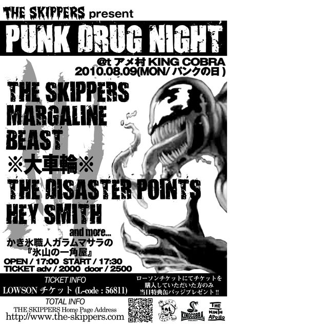 THE SKIPPERS presents "PUNK DRUG NIGHT" 2010.08.09(パンクの日) 大阪心斎橋アメ村KING COBRA -CAST- THE SKIPPERS ※大車輪※ BEAST HEY-SMITH THE DISASTER POINTS MARGALINE and 1 GUEST band!! -FOOD- かき氷職人ガラムマサラの『氷山の一角屋』 OPEN / 17:00 START / 17:30 LOWSON TICKET ?2,000 L-CODE(L-56811)発売中 ローソンチケットにてチケット購入者には当日特典イベント缶バッジをプレゼント。 ※各バンドメール予約では特典はありません。ぜひローソンチケットでの購入をオススメします。 メール