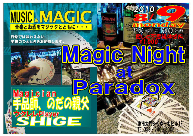 またまた懲りずにやりまっせい・・・ お盆前の忙しい時期では御座いますが 多くの方のご来場をお待ちいたしております。 女性大歓迎、おっさん大歓迎 癒されて、おどろいて、叫んで たのしも〜よ Start @ 20:00〜 不思議体験料 \1,000 ♪ ★手品師のだの親父 ★SHIGE ウクレレ演奏♪ 目の前30センチの不思議 ♪ 目の前30センチの奇跡 ♪ この世は、老いも若きも、男も女も 不思議を求める人ばかり・・・ ウクレレの奏でる素敵なメロディーと共に ごゆっくりと御堪能くださいませ〜