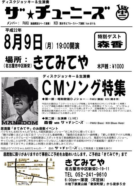 管理人様、コミュニティ参加者の皆様、告知失礼します。 昭和歌謡曲DJユニット「ザ・チューニーズ」です 8月9日(月)に 名古屋新栄の居酒屋「きてみてや」さんで、おもしろ昭和歌謡曲DJショーを開催します キッチュでグルービーな昭和歌謡にスポットを当て楽曲解説を加えるという、風変わりなお座敷DJショー。昭和AMラジオ番組風、爆笑ナイト! 過去 「聴けば聴くほどよく似てる!? ソックリさん楽曲特集」 「魅惑の日本語カバー曲特集」 「愛しの薄幸女性アイドル特集」を開催してきました 今回のお題目は「CMソング特集」 古