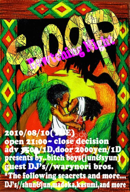 失礼します。 イベントやります〜 8月10日の八時から体が痛くなるまで朝まで! 今回は、ボディーアート(消えるタトゥー)のアーティストをコラボです! REGGAE&SKA&funkJazzなどをメインに23:30くらいからHouse&Electroに変貌しますので、両面楽しめるかと思います! 大好評の「おいしいテキーラボール」今回も出します 宜しくお願いします!主催は、シャカラックのJunpei君と古着市のShunsukeです。21歳中心でやってます!未熟者ですがお手柔らかにお願いします。 ↓詳細↓ soap vol.3 Bewitching Night Date
