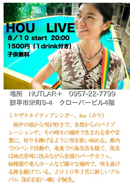 失礼します。 houちゃんがやって来ます。近隣の方、ふらりと遊びに来て下さい。 nutral+ 8/10 20:00より 1500円1drink付き 子供無料