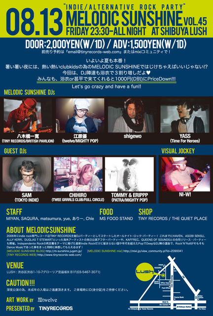 MELODIC SUNSHINEコミュニティ(http://mixi.jp/view_community.pl?id=2090041)にて、お得な前売りディスカウント予約(1500yen/D込)も有!