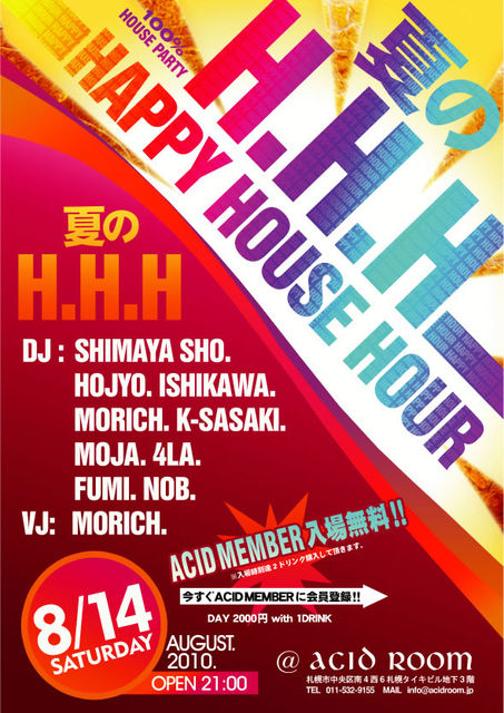HOUSE MUSICで週末にHAPPYな時間を提供するPARTY!!! 実力派のHHH DJ陣がクオリティの高いHOUSE MUSICでフロアを盛り上げます。 8月は夏のH.H.Hと題して、日頃の感謝の気持ちを込めまして ACID MEMBERは入場無料!!! 是非!遊びに来てみてください。 MEMBER登録まだの方は↓どうぞ http://www.acidroom.jp/member2.html チャペル8/14(sat) 100%HOUSE 『夏のH.H.H』 HAPPY HOUSE HOUR @ACIDROOM http://www.acidroom.jp ■DJ SHIMAYA SHO/HOJYO/ISHIKAWA/MORICH/K-SASAKI/MOJA/4LA/FUMI/NOB ■VJ&DJ MORICH
