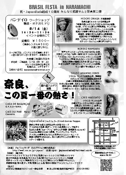 祝・Japaxelada結成10周年★みんなに感謝せんと祭!第二弾 クローバー【ならまち ブラジルフェスタ2010】 クローバー ■8月14日(土) ■11時〜17時(10時半〜翁長巳酉パンデイロワークショップ) ■奈良町あしびの郷(さと) ■入場料 1000円★ ※前売り券お持ちでなくても、入場していただけます。 【Special☆Ticket】 プレゼント付きの先着100名様限定チケット発売中!! ☆るんるんプログラムるんるんプレゼントJapaxelada LIVE ゲストパフォーマンス♪ ・Bossa Nova、MPB,Forro LIVE /Cris Maissato