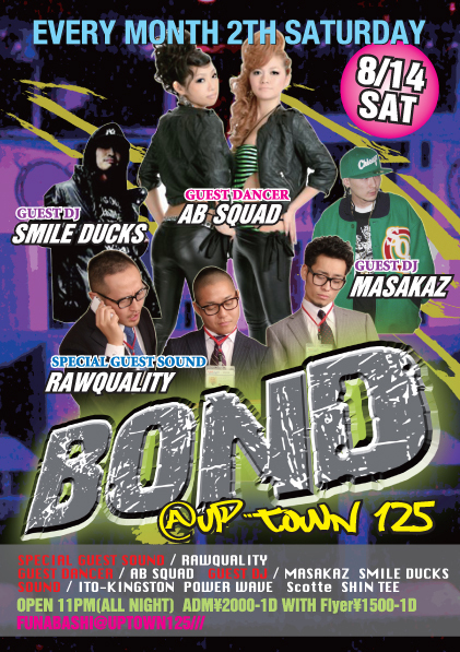 8/14(SAT) BOND 船橋@UP TOWN 125   【SPECIAL GUEST SOUND】 ■RAWQUALITY 【GUEST DANCER】 ■AB SQUAD 【GUEST DJ】 ■MASAKAZ ■SMILE DUCKS 【SOUND】 ■ITO-KINGSTON ■POWER WAVE ■Scotte ■SHIN TEE OPEN 11PM(ALL NIGHT) ADM¥2000-1D WITH Flyer¥1500-1D ●船橋@UP TOWN 125 ↓ http:// www.upt own125. com/ 船橋市夏見1-10-31 2F TEL047-425-0071