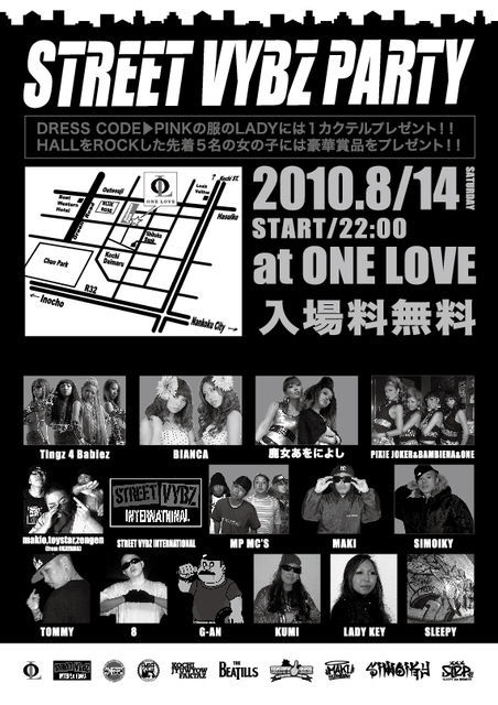 管理人様、告知失礼致します 。 STREET VYBZ PRESENTS 『STREET VYBZ PARTY』 2010.8.14(SAT) @:ONE LOVE START/22:00−?????????? ADM:FREEEEEEEEEEEEEEEEEE!!!!! <DRESS CORD>  PINK(PINKの服のLADYには1カクテルプレゼント) *HALLをROCKした先着5名のLADYには豪華賞品プレゼント!! *振る舞いテキーラ&土佐鶴用意してます!!!! -GUEST DANCER-  Tingz 4 Babiez  鹿女あをによし  PIXIE JOKER&BAMBIENA&ONE  BIANCA -GUEST DEE JAY&MC-  Makio  Toystar  Zengen from,OKAYAMA -LIVE- MPMC'S MAKI SI