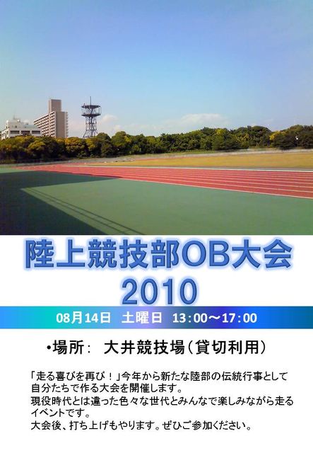 今年の夏に陸上部のOB・OGのみんなが走る大会を 開催します!! 当日、競技場は貸切です走る人 短距離や長距離など、個人の種目だけでなく、 男女混合、色々な世代が集まった混合チームでリレーも開催します。 チームで競う、小さな運動会のように楽しめるようになっていますわーい(嬉しい顔) 大会後は打ち上げもあります。(場所は八潮地域センターです。) (地域センター →http://asp.netmap.jp/map/2500212861.html) 参加費ですが、競技に参加する人は3500円です。 競技に参加せず、観覧する方は1500円です。 (どちら